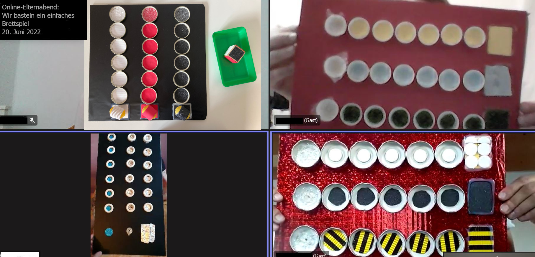 Am Montag, 20. Juni 2022 trafen sich drei FEB-Familien vor dem Bildschirm zum Online-Elternabend „Wir basteln ein einfaches Brettspiel“. Es sollte ein einfaches Brettspiel entstehen, das an die individuellen Bedürfnisse des eigenen Kindes angepasst ist. Dabei spielten vor allem gute Kontraste sowie die Möglichkeit zur taktilen Wahrnehmung und Orientierung eine wichtige Rolle.