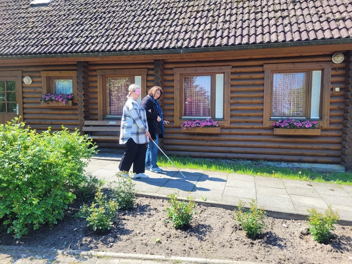 Am 13. Mai 2023 luden wir, ein kleines Team der FEB, zu einer ganztägigen Fortbildung für Fachkräfte in die Räume der „Hollager Mühle“ in Osnabrück ein. Unsere Gäste sollten die Möglichkeit bekommen unter der Augenbinde bzw. unter der Simulationsbrille eigene Erfahrungen zu machen. Unser Ziel war, dass die teilnehmenden Personen, die von ihnen betreuten Kinder besser verstehen und betreuen können. Dazu bauten wir verschiedene Stationen (Thementische) auf, bei denen es etwas zu tasten, riechen, schmecken und natürlich auch zu sehen gab. An den Stationen ging es darum, bestimmte Aufgaben zu bewältigen, z. B. ein Spiel tastend zu spielen. Jeweils zu zweit konnten sie mit Augenbinde und Langstock das Gelände erkunden. Das Gelände der „Hollager Mühle“ besteht aus Wegen, Wiesen und Gestrüpp. Es gibt Steigungen und Senkungen, auch Teiche mit Brücken. Die Orientierung unter der Augenbinde mit Langstock ist unter diesen Bedingungen nicht einfach. Deswegen sollte immer eine Person ohne Augenbinde auf die andere aufpassen.