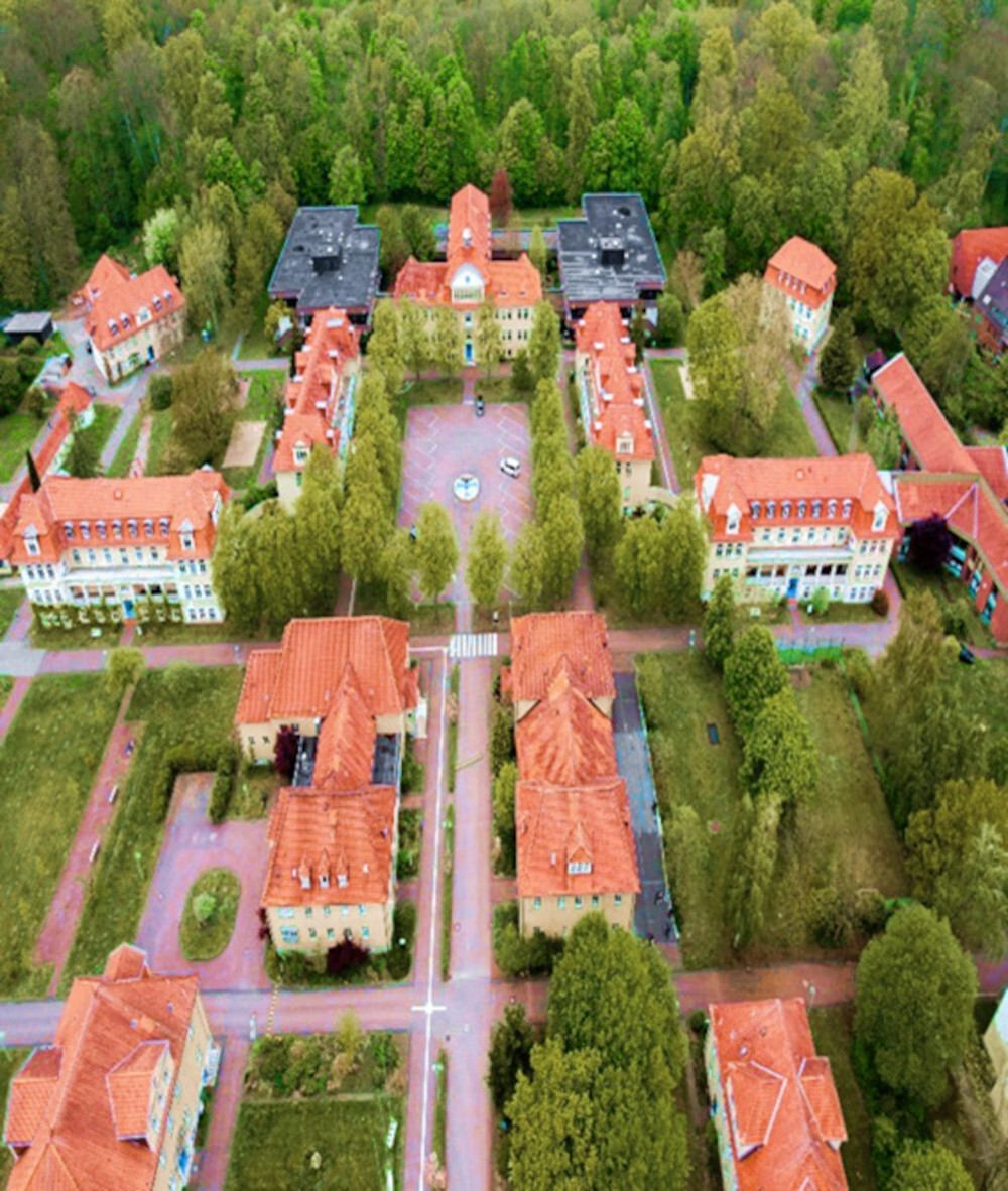 Luftaufnahme vom Gelände des LBZB. Das Gelände hat einen symmetrischen Aufbau. Der Weg in der Mitte führt zu einem größeren innenliegenden Platz mit Brunnen. Hinter den Gebäuden beginnt der Wald (Eilenriede).