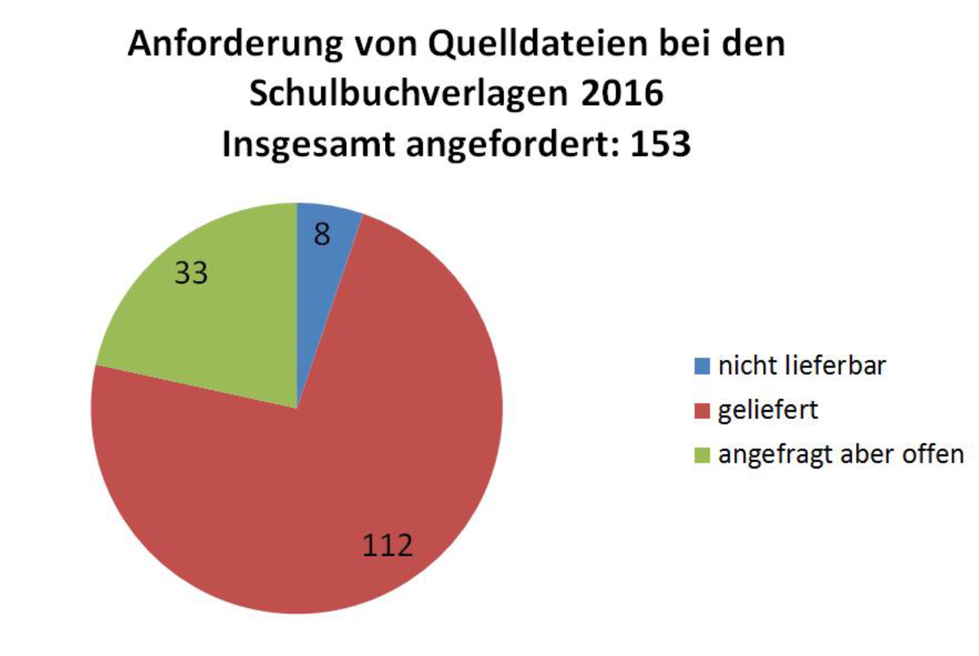 Erläuterung: 153 Schulbuchdateien wurden über die Koordinierungsstelle zur Vergabe der Schulbuchdaten in Friedberg angefragt, 112 Schulbuchdateien konnten geliefert werden. 8 Dateien konnten entweder nicht geliefert werden, weil sie nicht vorhanden bzw. veraltet und somit für uns nicht brauchbar waren, oder weil der