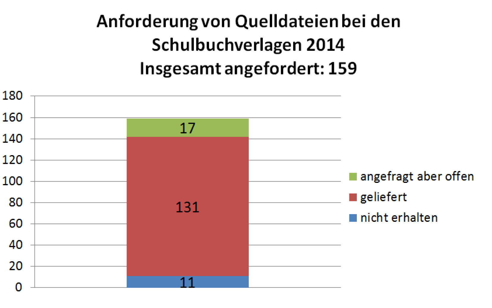 Erläuterung: 151 Schulbuchdateien wurden über die Koordinierungsstelle zur Vergabe der Schulbuchdaten in Friedberg angefragt, 131 Schulbuchdateien konnten geliefert werden. 16 Dateien konnten entweder nicht geliefert werden, weil sie nicht vorhanden bzw. veraltet und somit für uns nicht brauchbar waren, oder weil der Schulbuchverlag, dessen Buchdatei angefragt wurde, nicht im Verband