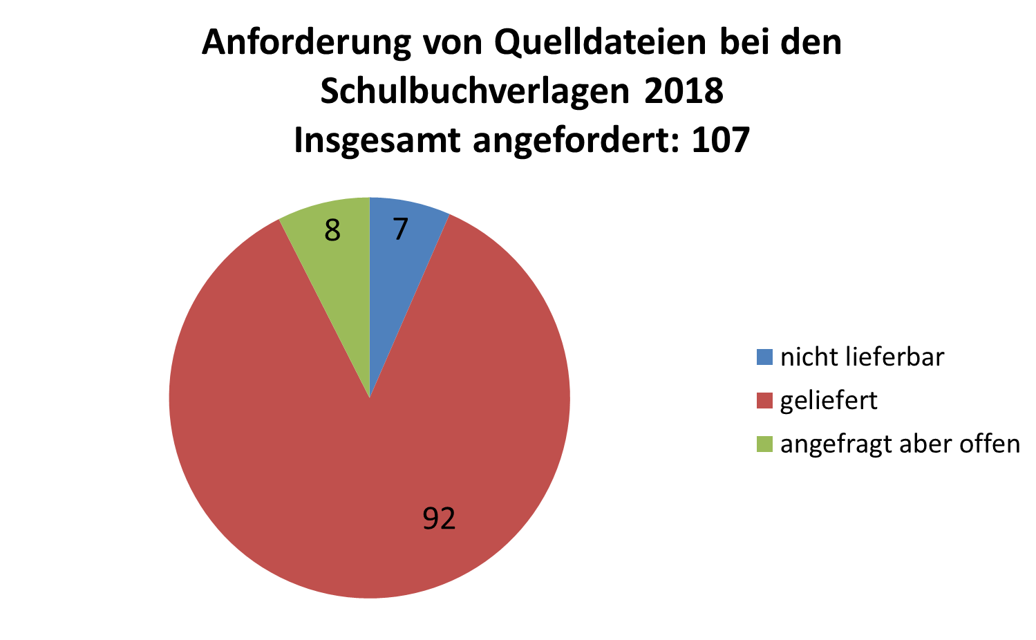 Erläuterung: 107 Schulbuchdateien wurden über die Koordinierungsstelle zur Vergabe der Schulbuchdaten in Friedberg angefragt, 92 Schulbuchdateien konnten geliefert werden. 7 Dateien konnten entweder nicht geliefert werden, weil sie nicht vorhanden bzw. veraltet und somit für uns nicht brauchbar waren, oder weil der Schulbuchverlag, dessen Buchdatei angefragt wurde, nicht im Verband Bildungsmedien e. V. (VBM) vertreten ist bzw. diese Dateien in Rechnung stellen wollte.