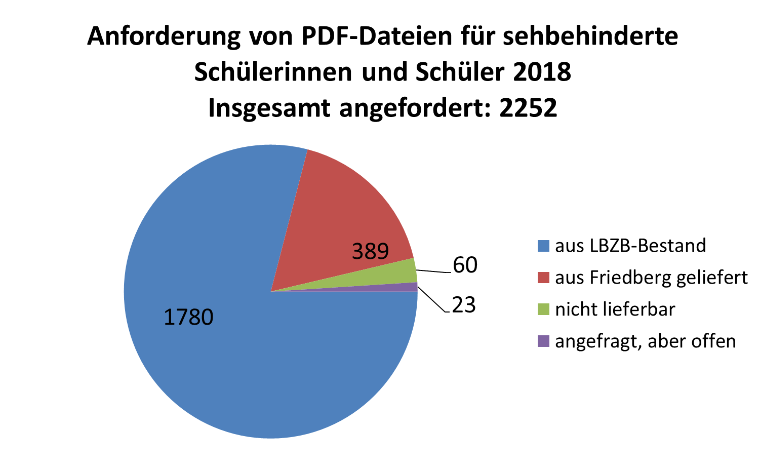 2018 wurden insgesamt 2.252 PDF-Schulbuch-Dateien bei der Medienzentrale angefordert, 60 waren nicht lieferbar. Es wurden 472 PDF-Dateien über die Zentralstelle in Friedberg angefordert, 1.780 PDF-Dateien konnten aus dem LBZB-Bestand entnommen werden.