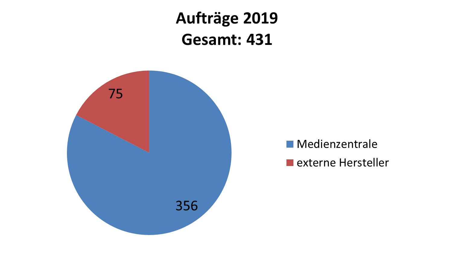 Erläuterung: Im Jahr 2019 lag die Anzahl der Aufträge bei 431 und ist im Vergleich zum Vorjahr gestiegen (+ 27). Es wurden Lehrwerke für die im LBZ B sowie inklusiv beschulten Schülerinnen und Schüler erstellt. 75 Übertragungen von Lehrwerken mussten extern erstellt werden, 356 Aufträge wurden von der Medienzentrale bearbeitet. Hier wurde durch den zeitlichen Aufwand der starke Anstieg der Vergleichs- und Abschlussarbeiten sowie die Übertragungen der Abiturprüfungen deutlich.