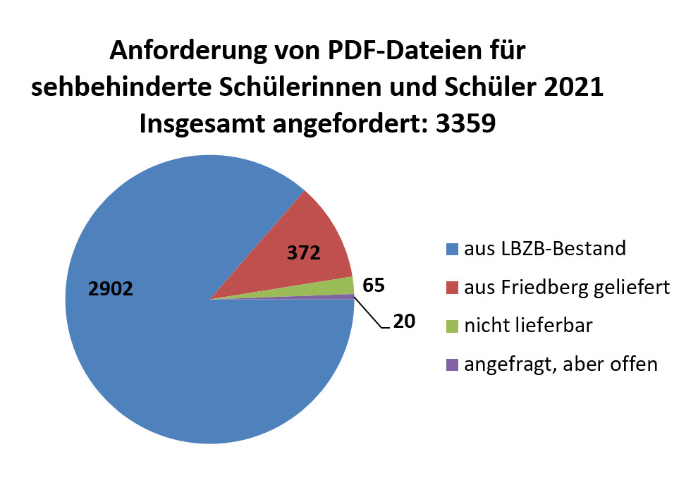 Die gelieferten PDF-Dateien werden archiviert, um so bei wiederholten Anforderungen darauf zurückgreifen zu können (2021: 2.902 PDF-Dateien aus LBZ B-Bestand). Der zusätzlich entstandene Bereich der PDF-Dateienvergabe bindet ca. 70 % an Arbeitszeit für eine Person in der Medienzentrale. Anzumerken ist auch die Tatsache, dass sehbehinderte Schülerinnen und Schüler für den Schulunterricht bis zum Sommer 2015 keine Schulbücher in digitaler Form bekommen konnten, ihnen demnach entsprechende Medien fehlten. Im Zuge der niedersächsischen Inklusion im Förderschwerpunkt Sehen konnte dieses Defizit durch die Freigabe der PDF-Dateien der Schulbuchverlage mit Unterstützung der Bundesfachkommission für Lehr- und Lernmittel und des VBM erfolgreich behoben werden.