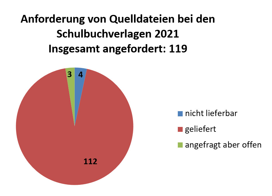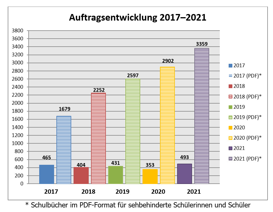 Erfreulicherweise ist durch die jahrelangen Bemühungen der Bundesfachkommission für Lehr- und Lernmittel an Sonderschulen (Blinde) und dem VBM der Vertrag erweitert worden. Seit Juli 2015 ist es ebenfalls möglich, Schulbücher im PDF-Format für den Unterricht der sehbehinderten Schülerinnen und Schüler in Niedersachsen anzufordern. Diese zusätzlichen Tätigkeiten wie Annahme und Bearbeitung dieser Aufträge werden von der Medienzentrale getätigt. Dass der Bedarf vorhanden und somit wichtig ist, zeigen die aktuellen Zahlen aus 2021.