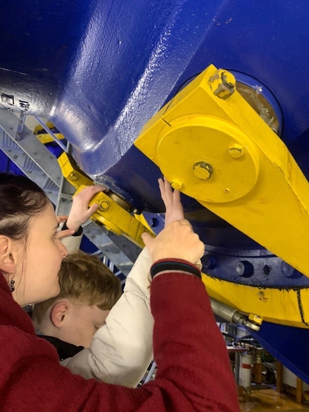 Man sieht einen Schüler, der beim Ertasten des sehr großen Turbinenrohrs über seinem Kopf durch eine Lehrkraft unterstützt wird.