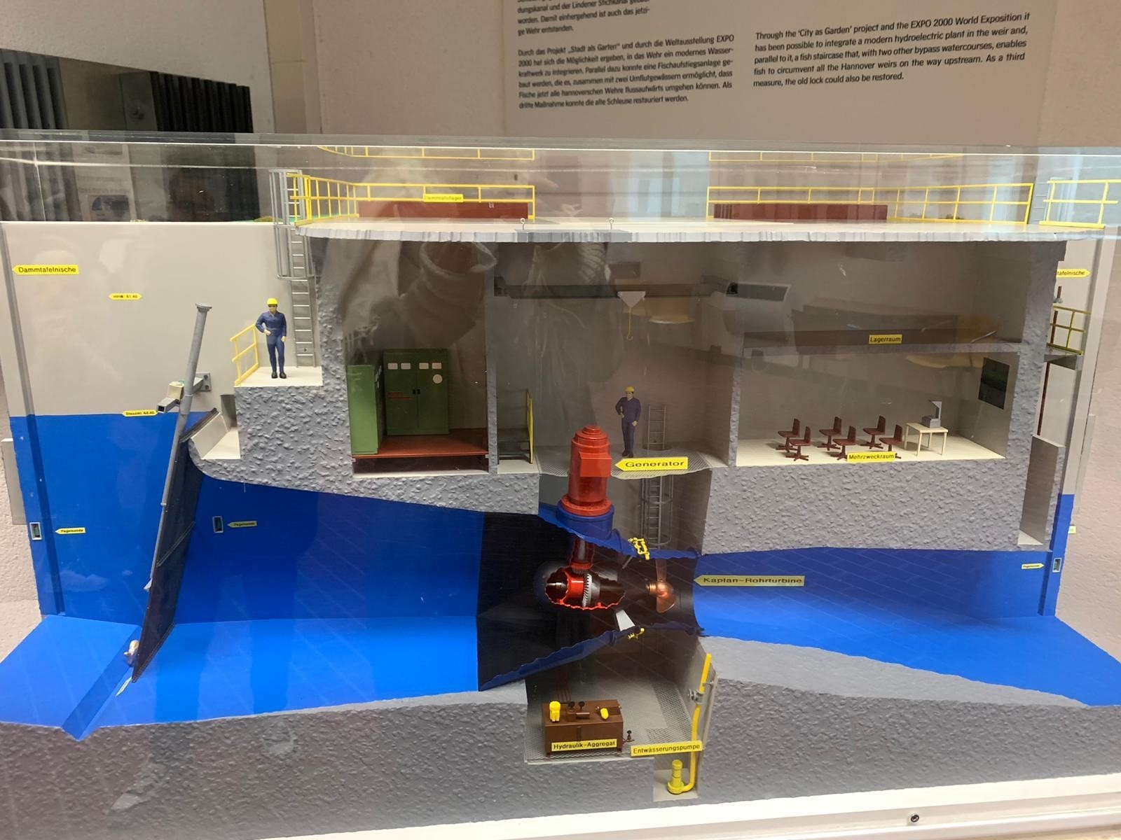Auf dem Bild sieht man einen Querschnitt durch das Wasserkraftwerk. Es sind unter anderem die beiden unterschiedlichen Wasserstände, die Turbine und der Generator abgebildet.