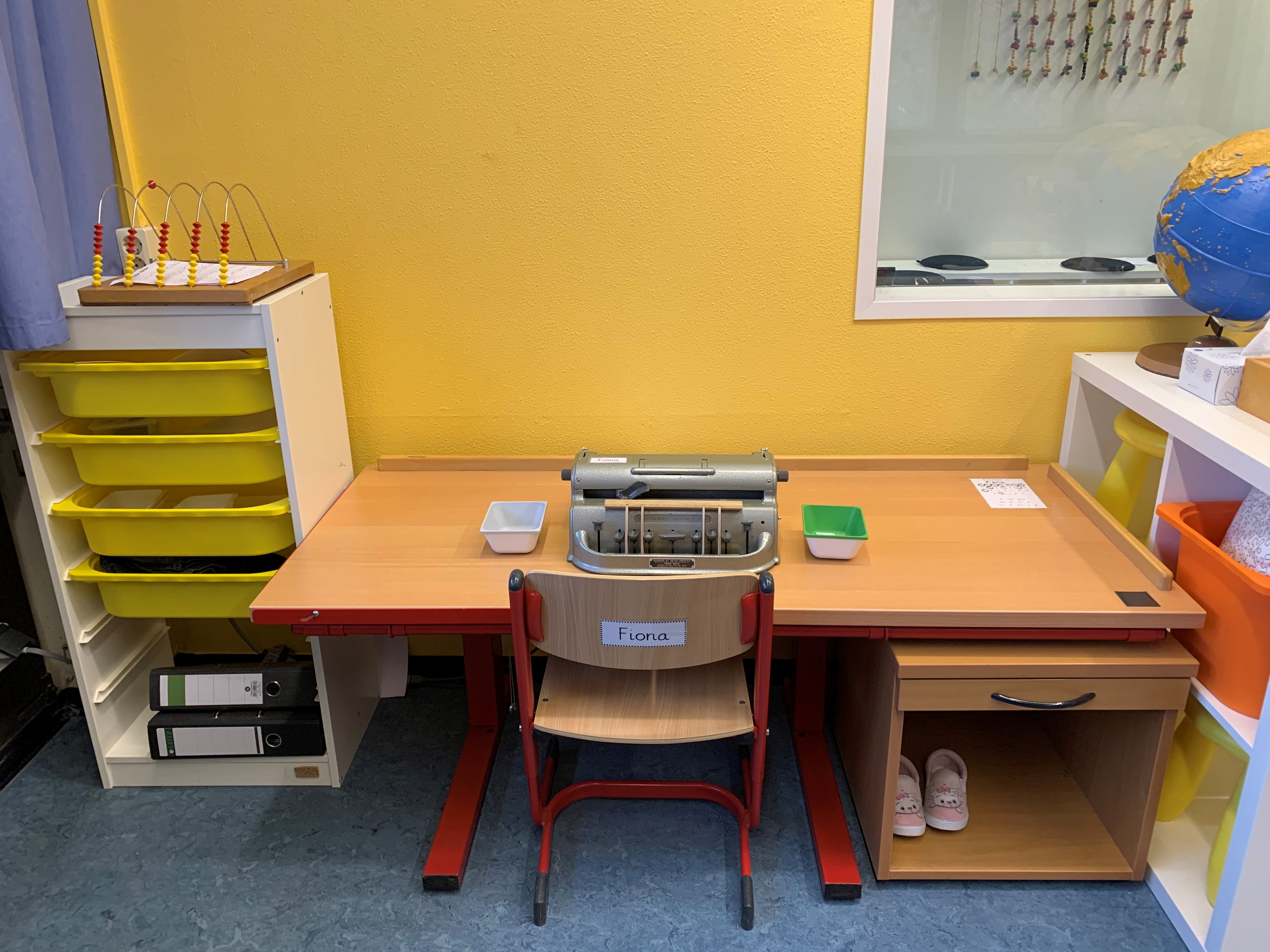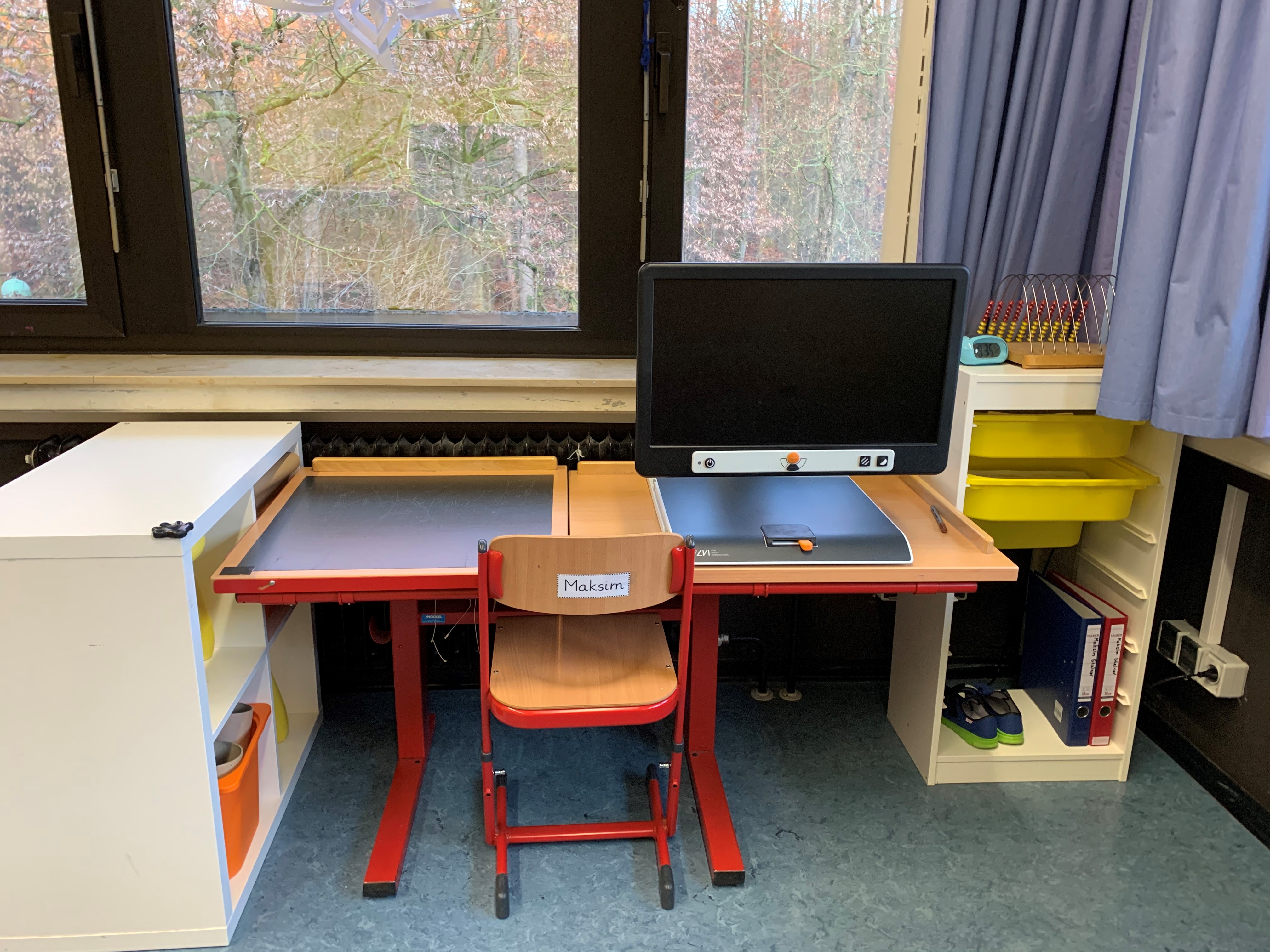 Jeder Klasse steht in der Regel ein Klassenraum mit einem angrenzenden Gruppenraum zur Verfügung. Unterstützt werden die Primarstufen-Klassen durch eine oder einen Freiwillige/n, sodass den Schüler:innen immer - auch in Pausenzeiten oder während eines Fachlehrerwechsels - ein direkter Ansprechpartner zur Verfügung steht,. Die kleine Lerngruppengröße, die spezielle Anordnung der Schülertische z. B. am Rand der Klassenraumwände, lichtoptimierte Räume, Blendschutzeinrichtungen und individuell ausgestattete Arbeitsplätze ermöglichen eine bestmögliche bedarfsorientierte Lernumgebung. Jeder Arbeitsplatz ist individuell an die Bedürfnisse der Schüler:innen angepasst, z. B. mit einer Punktschriftmaschine, speziellen Lampen, einem Bildschirmlesegerät, höhen- und neigungsverstellbaren Tischen sowie ab Klasse 3 mit einem Computer.