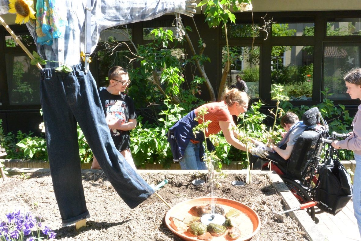 Am Hochbeet buddelt Noah Pflanzlöcher für die Tomatenpflanzen und setzt sie zusammen mit Frau Bode in die Erde, Marco bringt die Pflanzen auf seinem Rollstuhltisch mit der Fsjlerin Merle zum Beet.