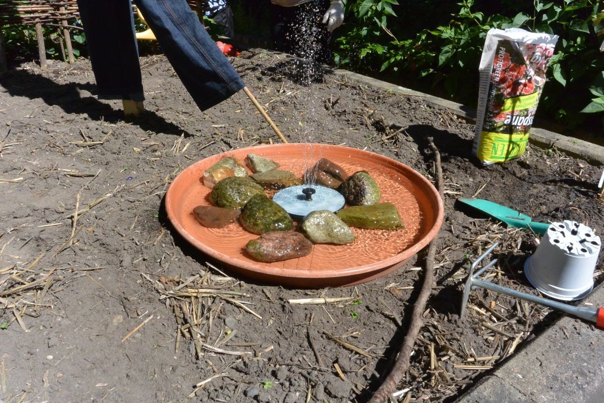 Auf unserem Beet steht ein Solarbrunnen, der sprudelt natürlich nur, wenn die Sonne scheint. Er steht einfach mitten auf einem großen Blumenuntersetzer und macht fast keine Arbeit, nur ab und zu muss das verdunstete Wasser nachgefüllt werden.