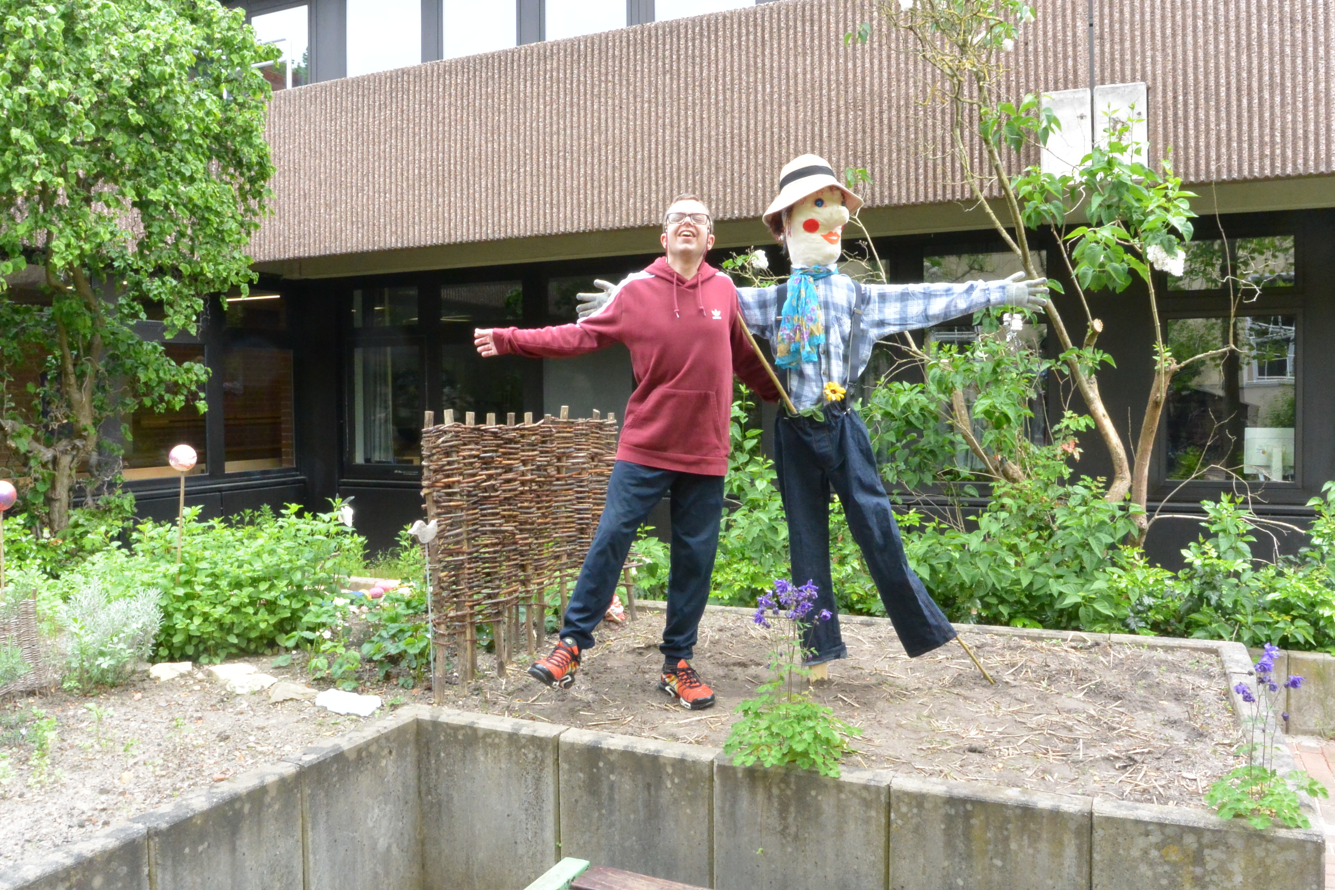 Auf dem Hochbeet steht Noah neben der lebensgroßen Vogelscheuche. Er umarmt sie und nimmt die gleiche Pose ein, wie Freunde, die herumalbern.