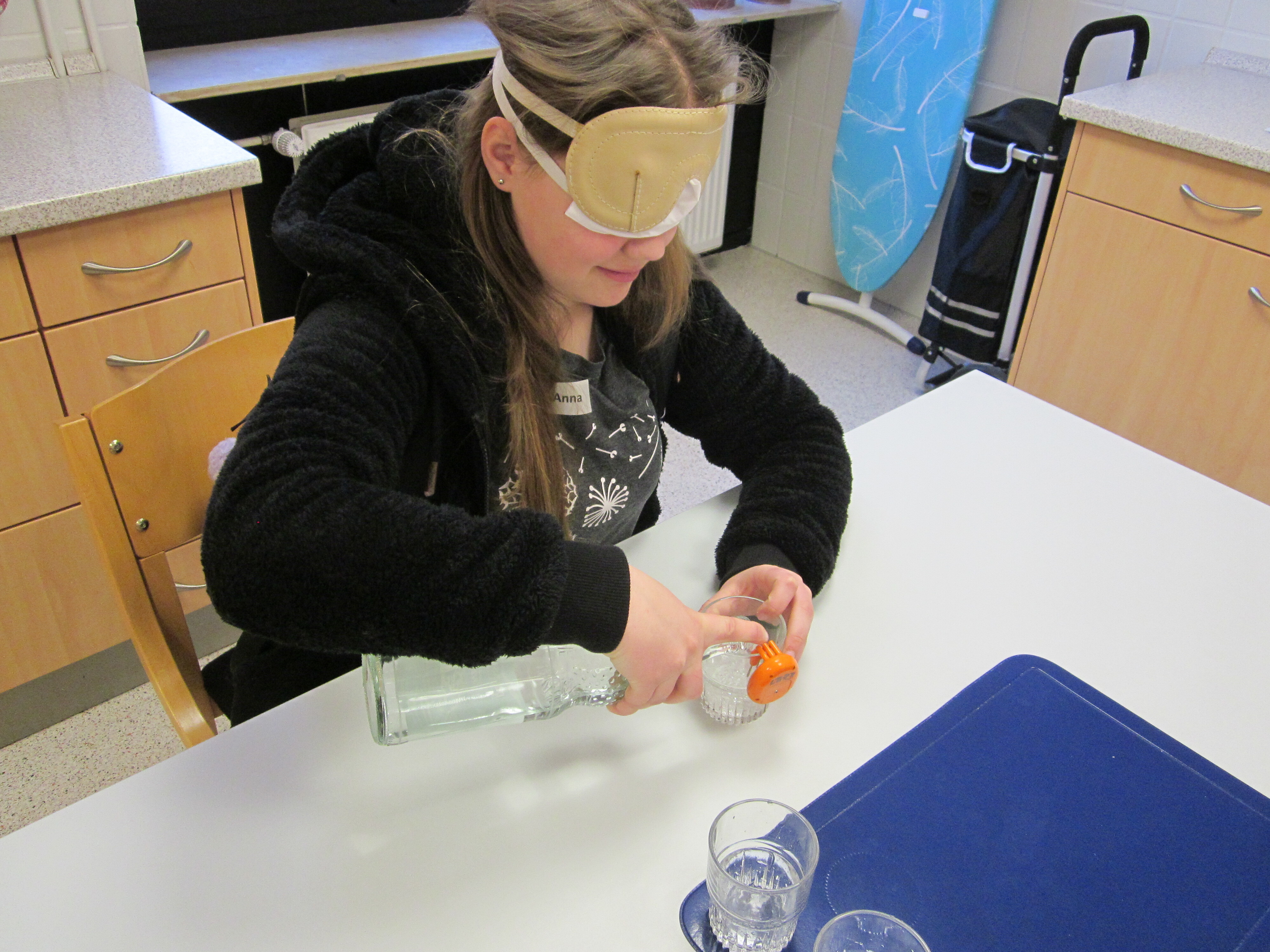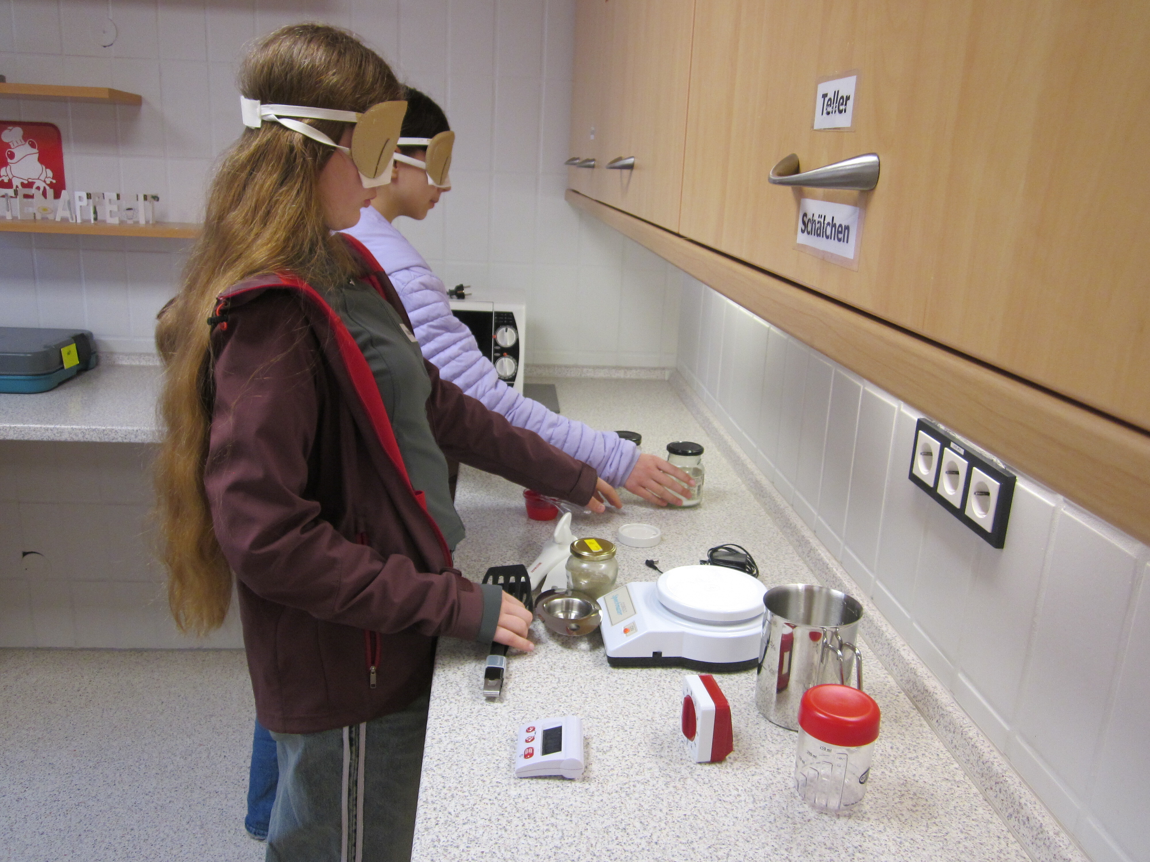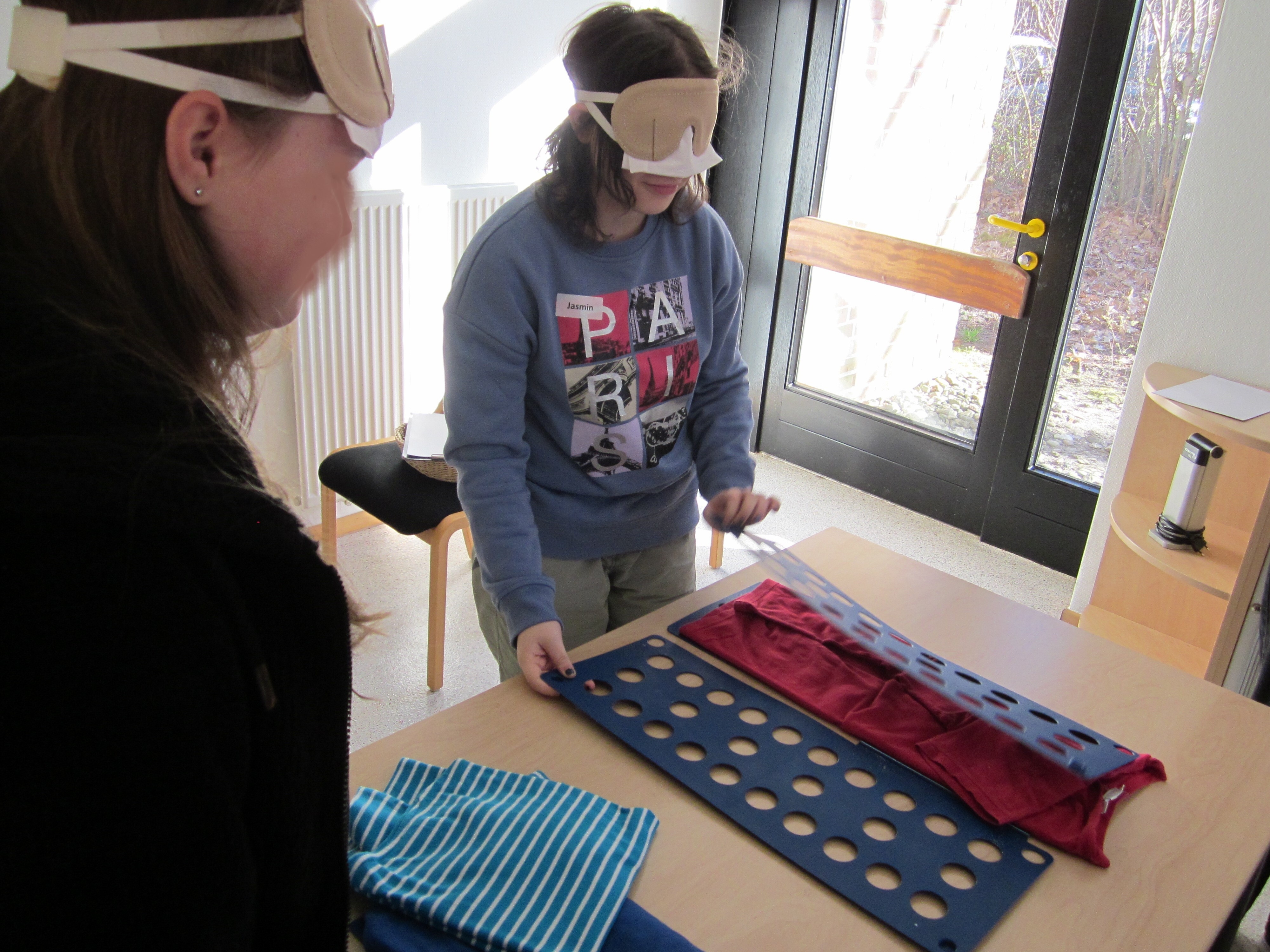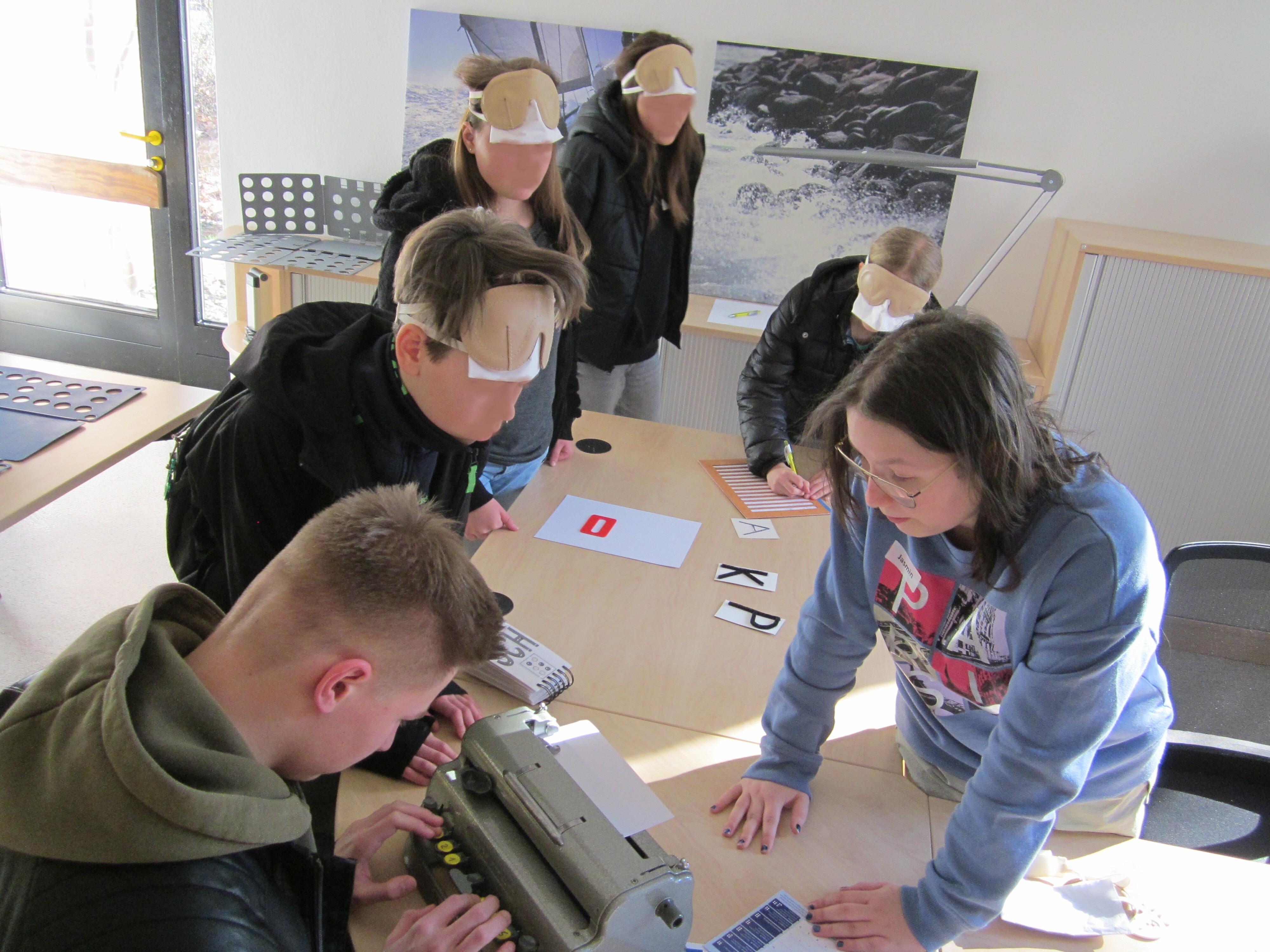 Danach sind wir in das Haus P gegangen und haben etwas über das Training für Lebenspraktische Fertigkeiten gelernt. Wir sollten unterschiedliche Sachen mit geschlossenen Augen erfühlen und raten, was es war. Anschließend sollten wir Erfahrungen unter der Augenbinde sammeln und z.B. einen anderen Raum finden. Das war gar nicht so einfach. Wir haben auch noch verschiedene andere Aufgaben unter der Augenbinde bekommen wie z.B. Sockenpaare zu finden, mit einer Punktschriftmaschine unseren Namen zu schreiben, Wäsche zusammenzulegen, Münzen mit Hilfe eines Münzsortierers zu sortieren oder Wasser mit einem Füllstandmesser in ein Glas zu füllen. Danach kam Orientierungs- und Mobilitätstraining dran. Dabei lernen blinde Kinder mit einem Langstock zu laufen und sich zu orientieren. Wir durften mit einer Augenbinde unter Anleitung mit einem Langstock über das Gelände gehen und sollten z.B. die Tiere der Arche Noah erfühlen, die im Innenhof steht. Es war ganz schön schwierig zu erraten, was das für Tiere waren, ohne sehen zu können.