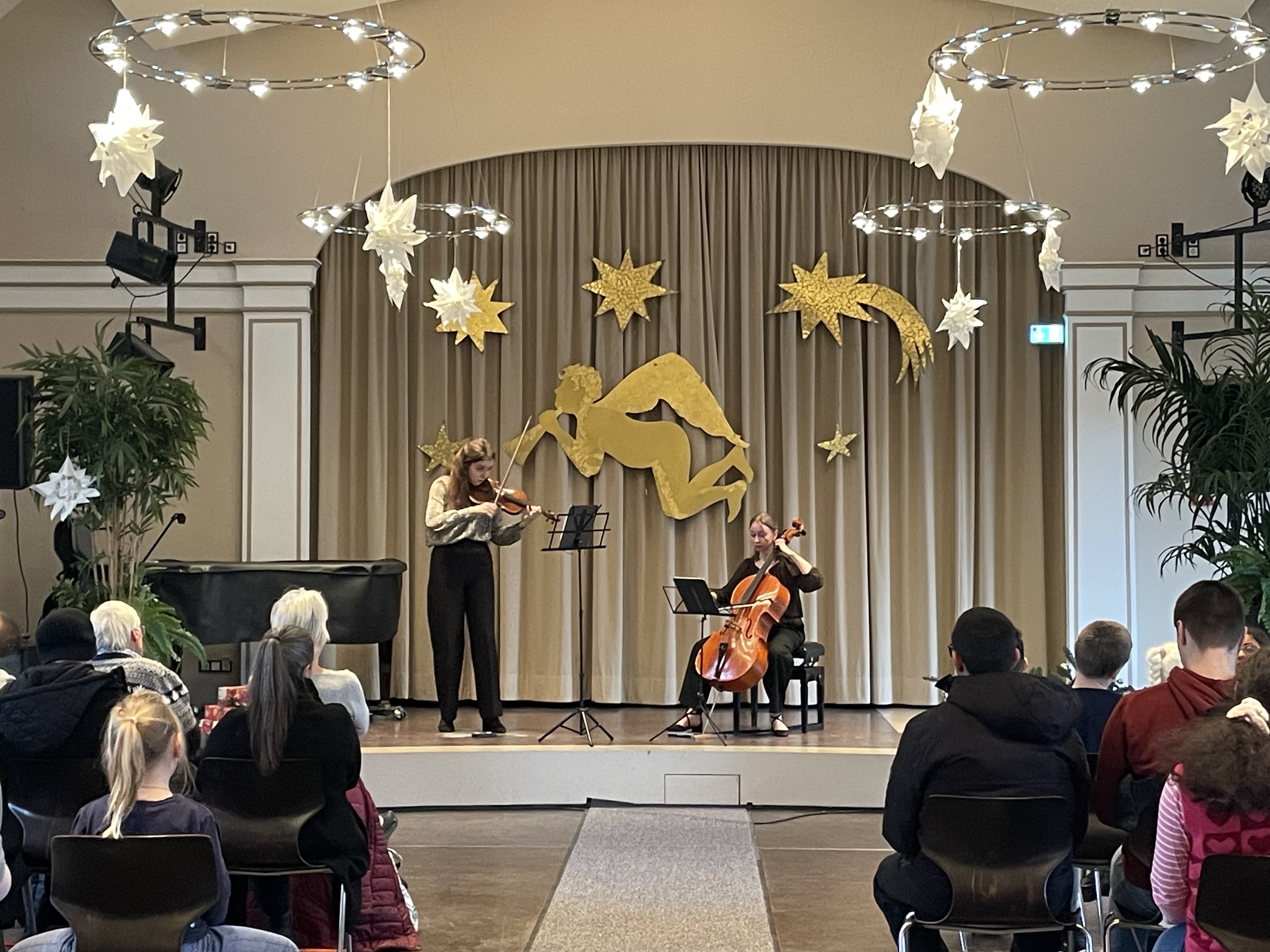 Heute waren Polina Elena Munteanu aus Rumänien und Stefaniia Yasnohorodska aus der Ukraine von Live Music Now bei uns zu Gast am LBZB. Mit ihrer Geige und ihrem Chello verwandelten sie unsere Aula musikalisch in einen wunderschönen Reigen. Einige Stücke waren bekannter, andere unbekannter, aber alle melodisch und passend für das Konzert ausgewählt. So hörten wir ua. eine kleine Nachtmusik von Schubert, einen ungarischen Tanz von Brahms und aus Tschaikowskis Nussknacker den Blumenwalzer. Bei vielen gespielten Weihnachtsliedern kam in der der schon weihnachtlich geschmückten Aula richtig Vorweihnachtsstimmung auf. Die Schüler und Schülerinnen honorierten jedes Stück mit einem anerkennenden Applaus.