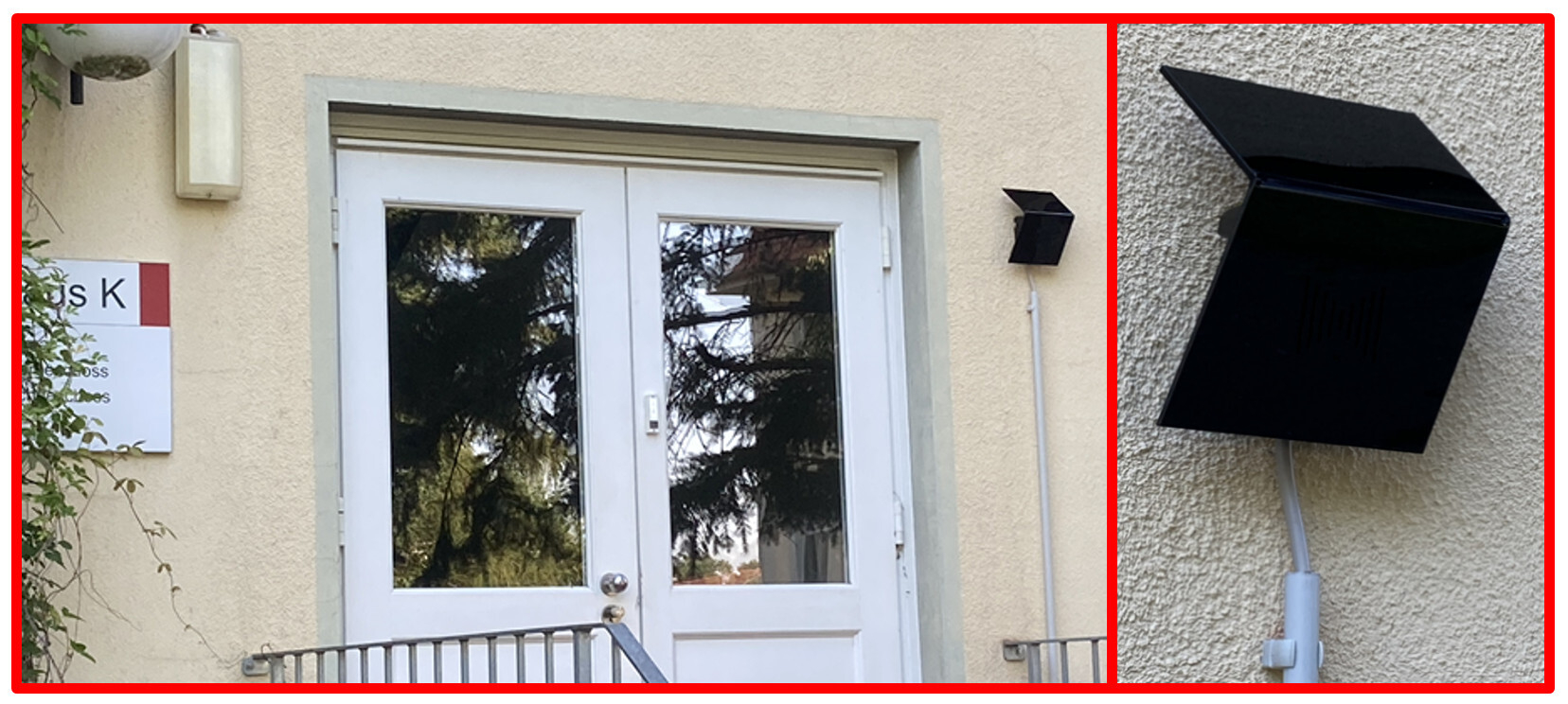 Haus K Hintereingang: Rechtsseitig neben der Tür ist ein LOC.id-Gerät mit integrierten Lautsprecher montiert.