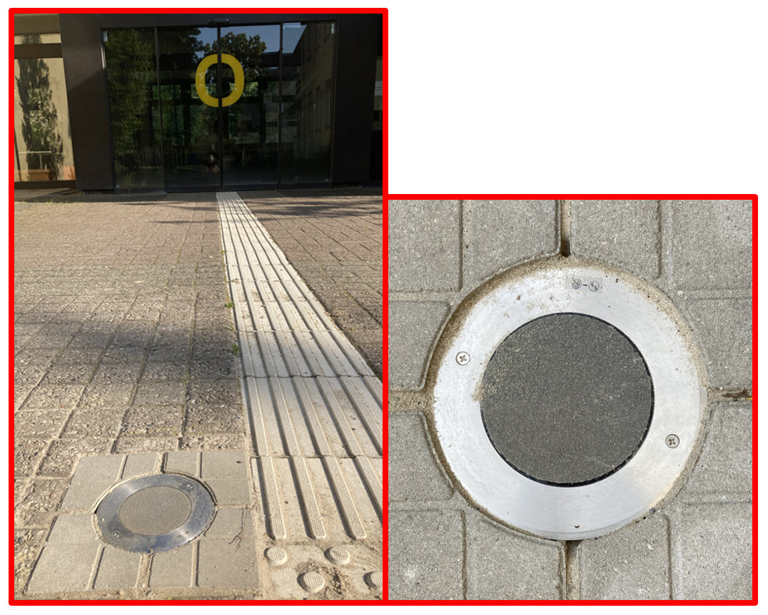 Haus M: Eingang Ost. In frontaler Ausrichtung zur Eingangstür befindet sich linksseitig neben dem taktilen Leitsystem ein im Boden eingebauter Lautsprecher.