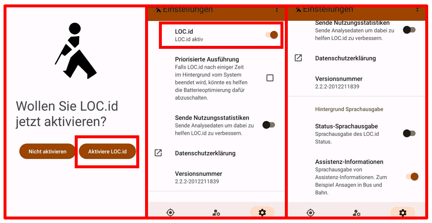 App-Ansicht „LOC.id“. Auf der linken Darstellung ist das rechte Feld „Aktiviere LOC.id“ mittels tippen zu bestätigen. Bei der mittleren Darstellung ist „LOC.id“ mittels Antippen des rechten Feldes zu aktivieren. Bei der rechten Darstellung können „Assistenz-Informationen“ mittels tippen des rechten Feldes aktiviert werden, um weitere Informationen zu erhalten.