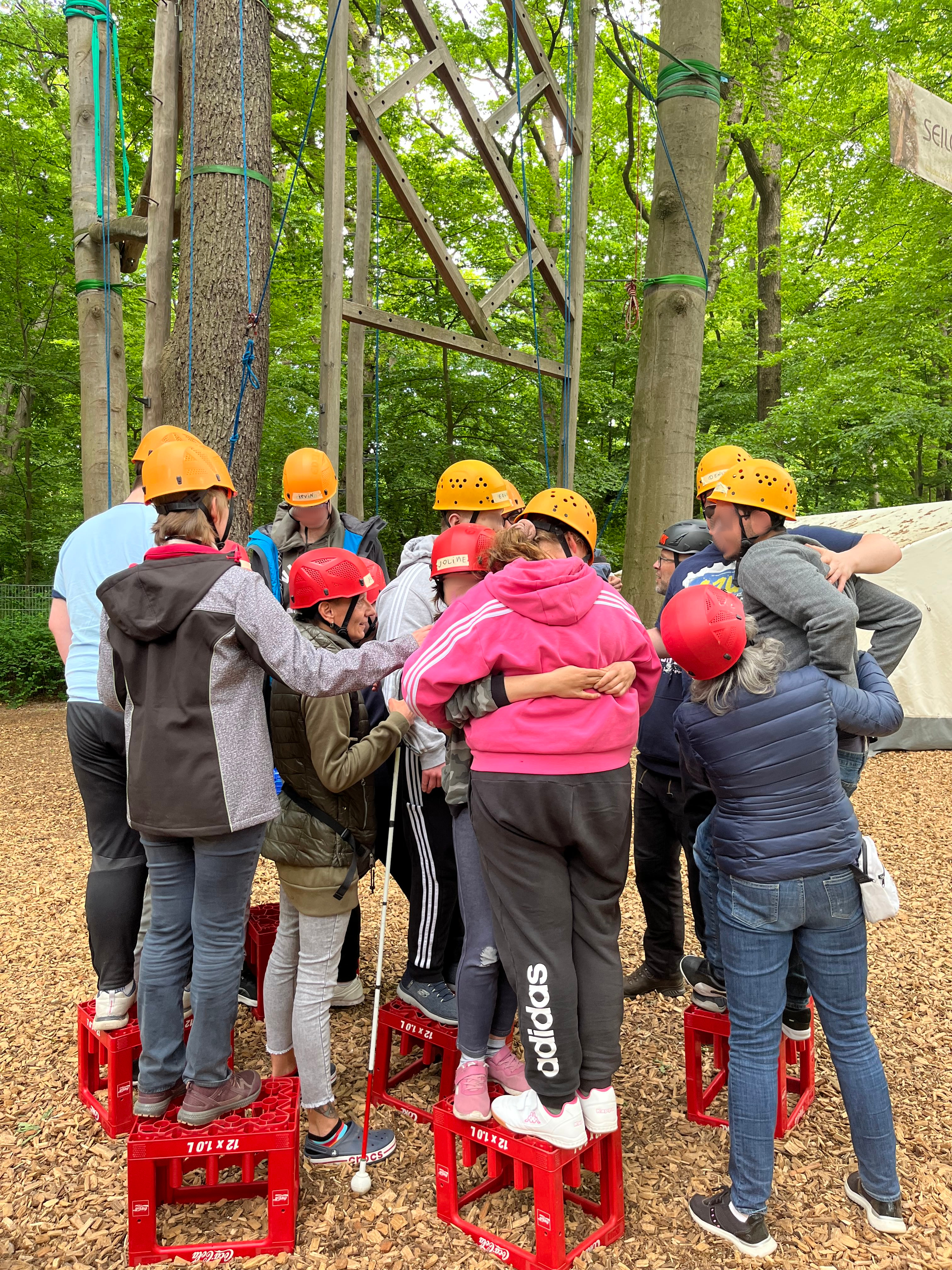 Nach dem Anlegen der Klettergurte und Helme startete die Gruppe mit einer Teamübung am Boden. Auf Cola-Kisten verteilt, galt es, die Balance zu halten, während nach und nach Kisten entfernt wurden. Dabei waren Kommunikation und gegenseitige Unterstützung gefragt. Ein gelungener Einstieg, der zur Zusammenarbeit einlud.