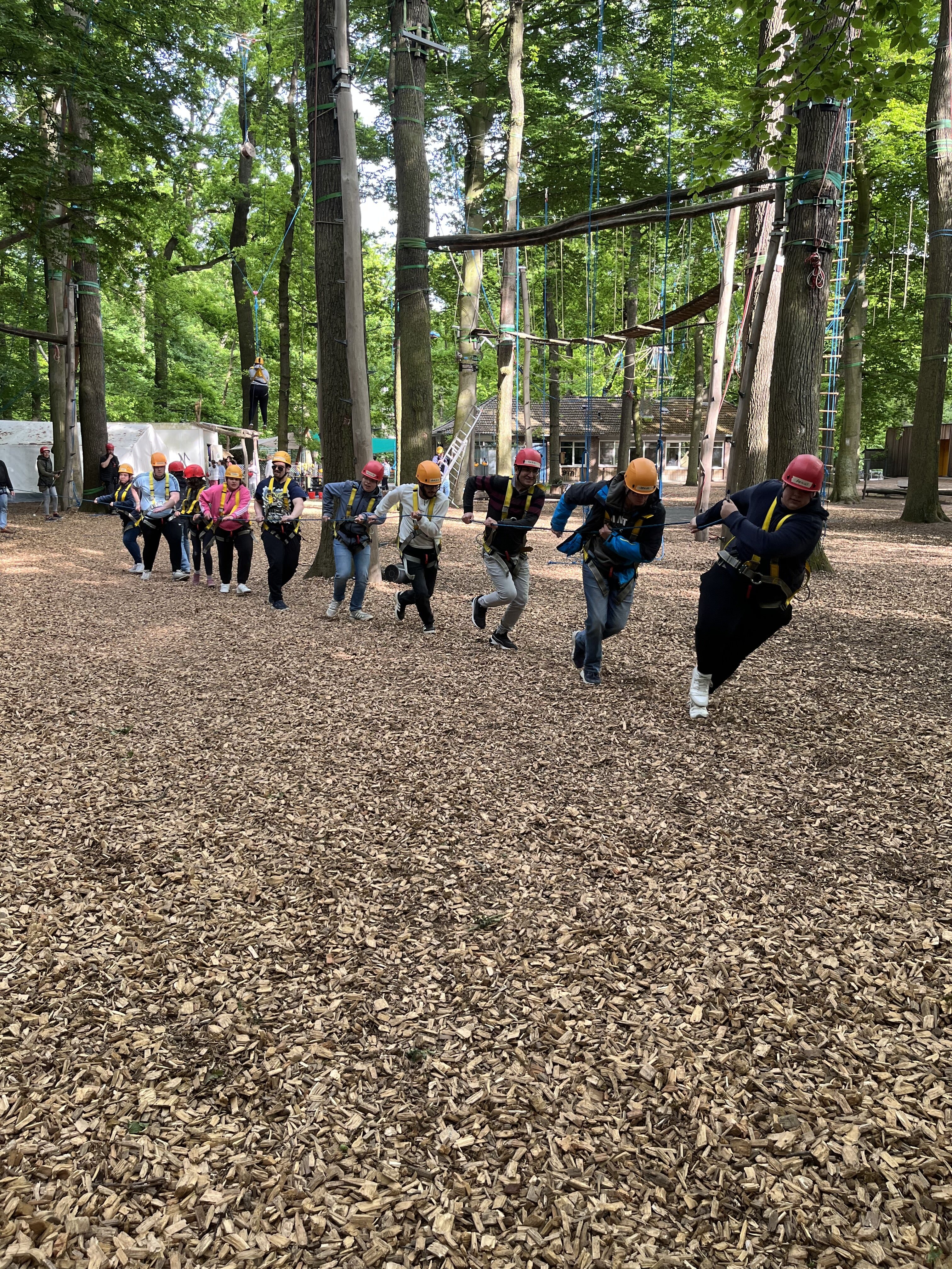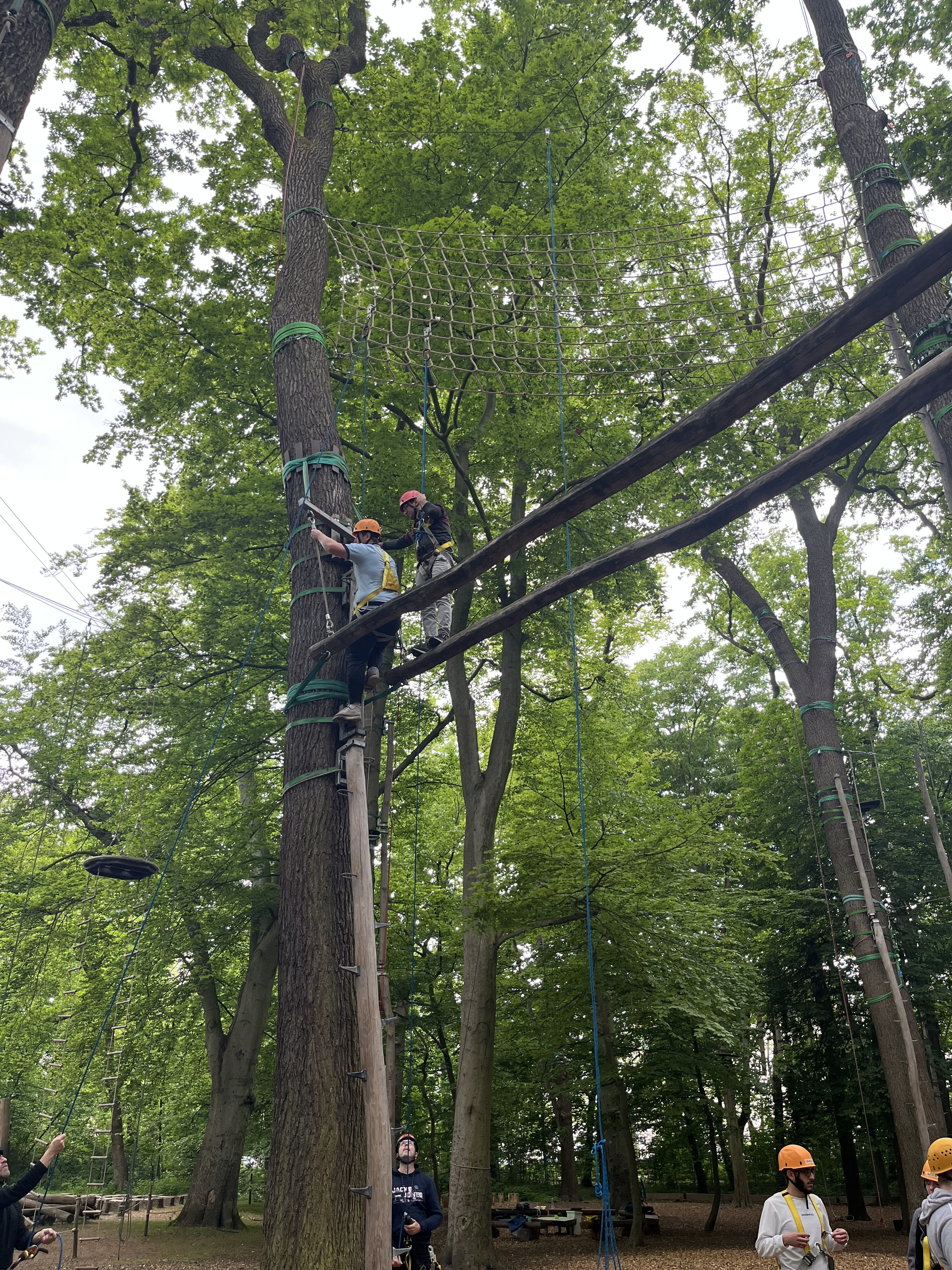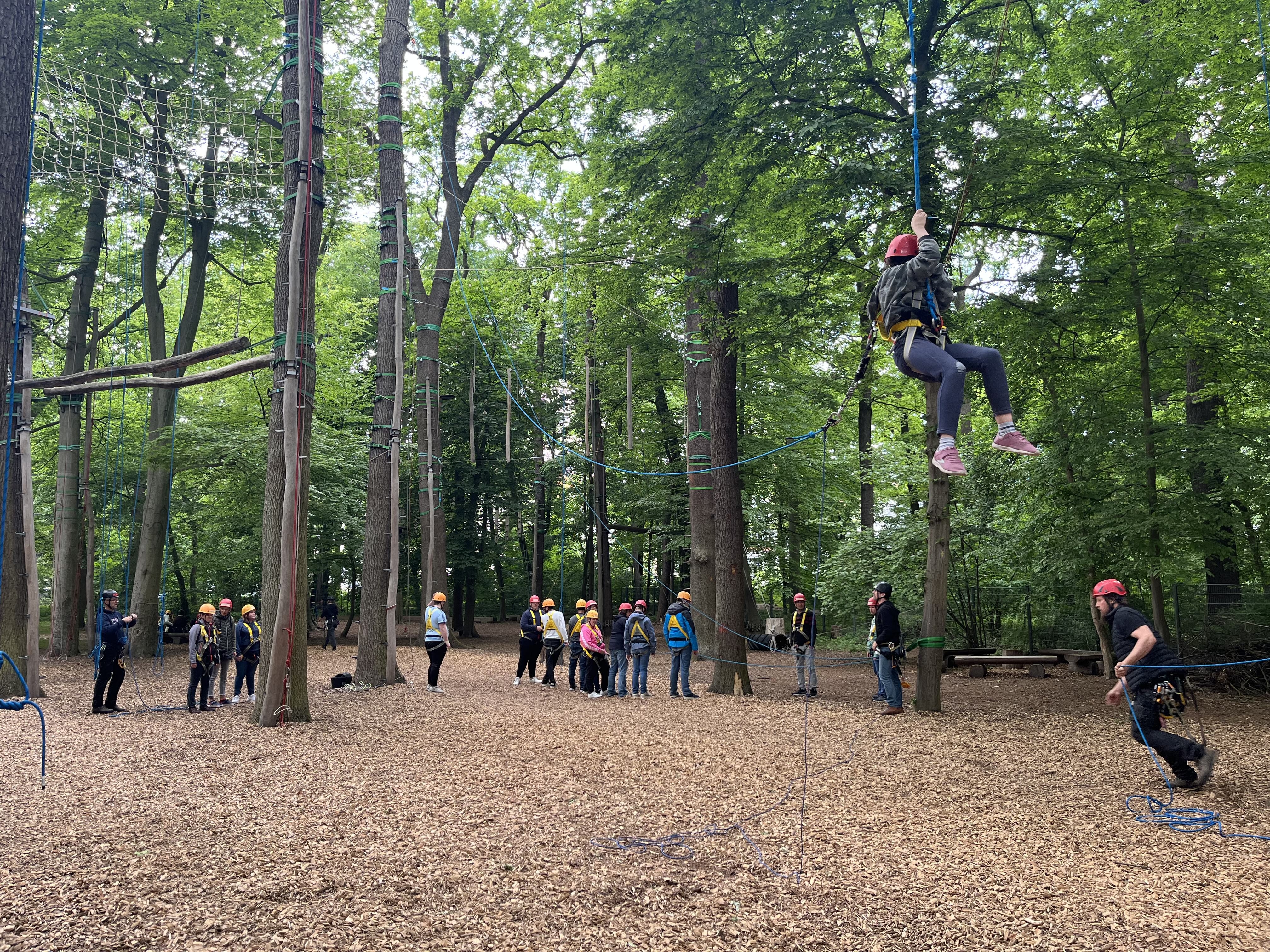 Im weiteren Verlauf wurde die Gruppe in drei kleinere Teams aufgeteilt. An verschiedenen Stationen in der Höhe konnten die Teilnehmenden über wackelige Brücken gehen, von Baum zu Baum springen oder auf Balken balancieren.